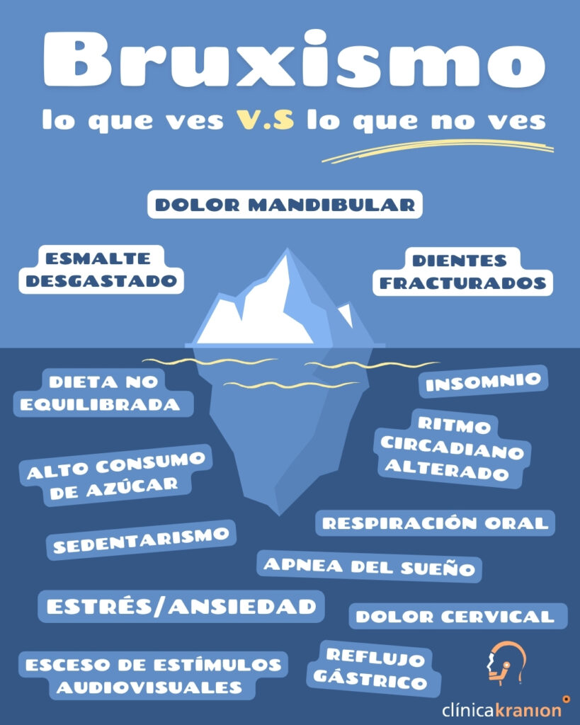 A nivel corporal, el bruxismo se relaciona con la presencia de dolor de cuello, mala calidad del sueño y alteraciones psicológicas, como cambios de humor y ansiedad, relacionados muchas veces con una mala adaptación al estrés (distrés).
